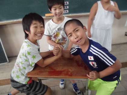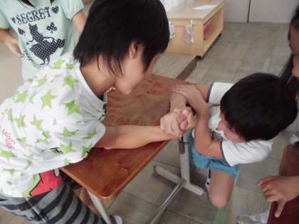 今日の中間休みには,あそび係主催の「腕相撲大会」がありました。男子と女子に分かれてトーナメントが行われて,それぞれの優勝者が決まりました。