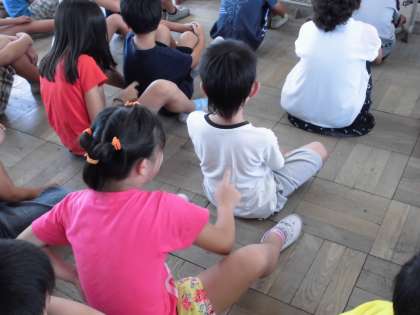 前の人が後ろの人の背中に漢字を書いていきます。