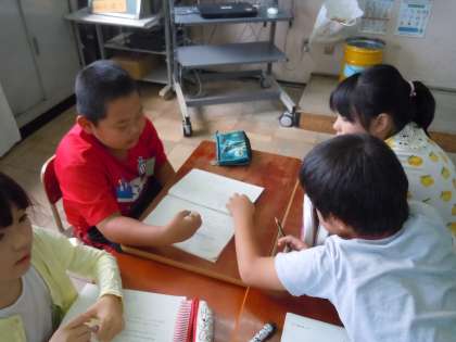 夏休み明け,最初の国語の学習は「詩を楽しもう」です。『「わたしと小鳥とすずと」「山のてっぺん」という二つの詩から,各グループで一つを選び,音読発表会をする』というゴールに向けて,今日は,グループごとで音読のくふうを話し合ったり,練習をしたりしました。これまでに使ってきた音読記号だけでなく,役割分担をしたり,動作を入れたりするなど,意欲的に活動する子どもたち。春に学習した「きつつきの商売」での活動が生きているなぁと感じさせてくれる1時間でした。次の時間は,いよいよ音読発表会です。