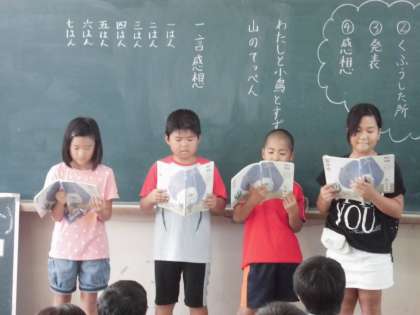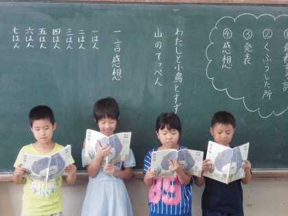 今日は詩の音読発表会をしました。「わたしと小鳥とすずと」「やまのてっぺん」の2つから班で選んだ詩の音読を発表しました。さまざまな工夫をした発表が続き,4月からの成長が感じられました。