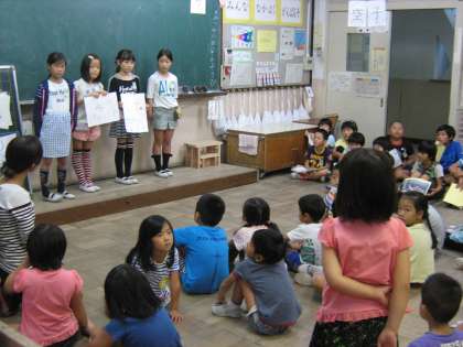 今日は,一年生の教室を訪ね,待ちに待った発表会を開きました。めあては,「1年生にいろいろな学校行事の楽しさを伝えよう」です。この日のために,たくさんの話し合いをしたり,インタビューをしたり,練習をしてきた3年生の子どもたち。1年生の教室に入ったときは,いつになく緊張した面持ちでしたが,いざ発表会が始まると,これまでの練習を生かして,のびのびと,そして堂々と話す子どもたちの姿がありました。また,聞き手の1年生も,“3年生のお姉さん・お兄さんのお話”に一生懸命耳を傾け,そして感想や質問も進んでしてくれました。そして最後,「学校生活が,楽しみになりましたか?」という質問に,1年生のみんなは,ほとんど全員の人が「はい!」と手を挙げてくれました。3年生と1年生,どちらの子どもたちにとっても,『楽しい学校生活』を創っていく上で,とても素敵なひとときになりました。