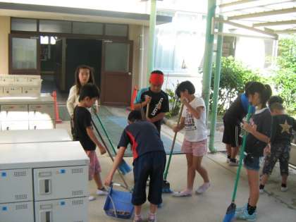 普段通りの掃除風景ですが・・・,よく見ると頭にハチマキを巻いている子どもがいますね。昼休みの応援練習のあと,そのまま掃除場所へと向かったのでしょう。ハチマキをきゅっと締めて,掃除にも気合が入ります?!