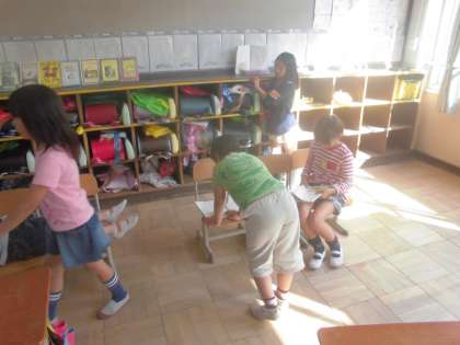 がまくんがお昼寝をする場面では,いすを並べて寝転んで読んでみたり,がまくんとかえるくんが玄関でお手紙の来るのを待つ場面では,実際に並んで座りながら読んでみたりと,いろいろな工夫をして,練習していました。