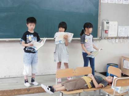 がまくんになりきって,いすをベットに見立てて寝転んで読んでみたり,かたつむりくんのように,ゆ〜っくり動いてみたり,たくさんの工夫が見られ,とても楽しい音読劇となりました。