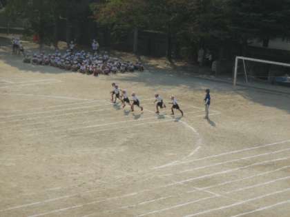 1年生の50m走です。校舎の3階から撮影した学校関係者ならではの貴重な(?)ショットです。上から見ると,「ほほう・・・,こんなふうに運動会が行われているのか・・・」と,少し新鮮な気分にもなります。