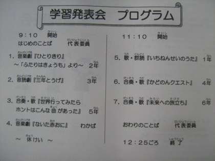 今日は学習発表会です。プログラムはご覧のとおりです。素敵な学習発表会になると思います。時間的な余裕をもって,早い目にお越し下さい。また,ご覧になった際には大きな拍手を送ってあげて下さい。子どもたちの大きな励みになると思います。