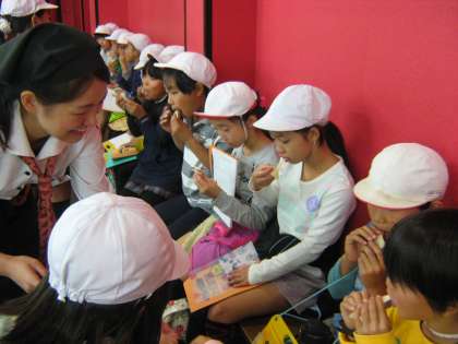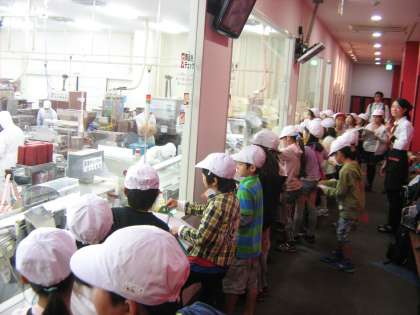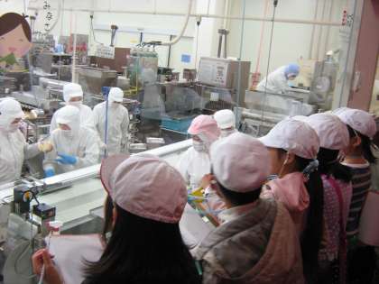 京都の伝統的銘菓を作っている工場を見学しました。事前に作り方を予想していたので,それと比べながら製造工程を調べることができました。材料や手順について,一通り教えていただいた後は,秋の商品「紫いも餡 生八つ橋」の出来立てのものを試食させていただき,「もちもち!」「おいもの味がする!」と,子どもたちはその味に感動していました。