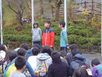 朝の集いの中で,リーダーさんや食事係さん,生活係さんが昨夜の係会で話したことを全体に伝達しています。「きのうは,5分前行動が出来ていたので,いろいろなことがスムーズに進みました。今日もがんばりましょう」など。