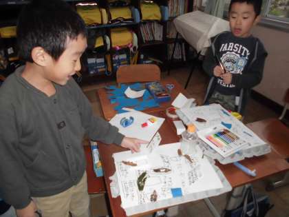 先日の秋みつけで見つけたどんぐりやはっぱを使って色々なものを作り,お店やさんごっこをします。