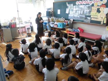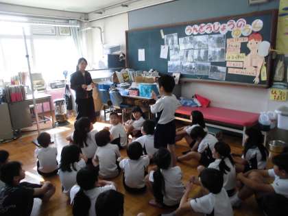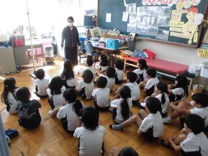 身体測定の前に,養護教諭の大石先生から「マスク」の使い方と使う理由についてのお話を聞きました。マスクは,菌の出入りを防ぐだけではなく,保湿の役割もしてくれるという話を聞いて子どもたちは「なるほど〜」とうなずいていました。