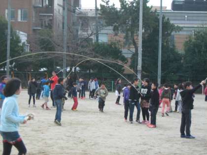 中間休みは体力づくりのために,全校で大縄に取り組んでいます。子どもたちの元気な声が運動場に響きます。日を追うごとに跳ぶ回数も増え,クラスの一体感も高まってきているようです。跳んで跳んで,寒さなんて吹き飛ばそう!