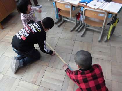 テープをつかって両手を広げた長さに合わせて切り,定規を使って上手に測っていました。