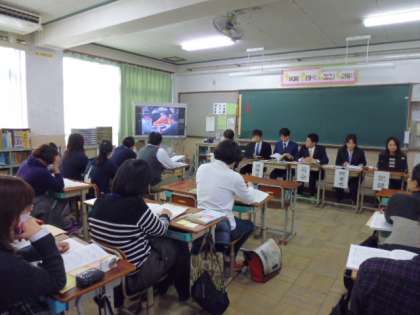 授業後は先生たちの研究協議会です。授業で子どもたちにどんな力を力をつけようとしたのか,そのためにどのような手立てや工夫を行ったのか,もっと子どもたちに届く授業をするためにはどのような改善策が考えられるかなどを話し合います。また,この1年間,本校が取り組んできた研究の成果や課題なども知ってもらいます。