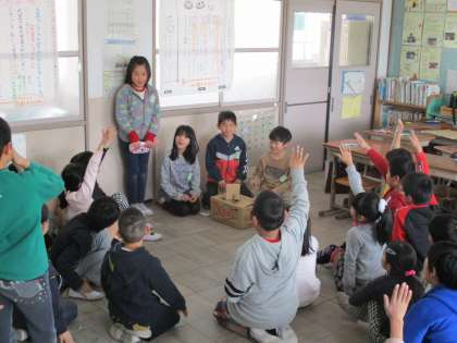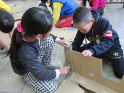 「ダンボールに切り込みを入れて,組み合わせたらどんな形になるだろうか?」ということで,今日は,グループごとで造形遊びに取り組みました。ダンボールを切るための道具「ダンボールカッター」を初めて使っての活動で,安全に気を付けつつ,それぞれのグループが家やお化け屋敷など,思い思いの作品を作っていました。最後には作った作品をクラスの前で発表し,仲間と協力して一つのものを作り上げる活動を,一人ひとりが楽しんでいる様子でした。