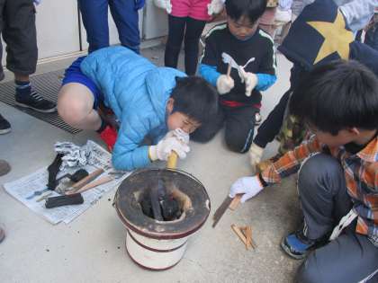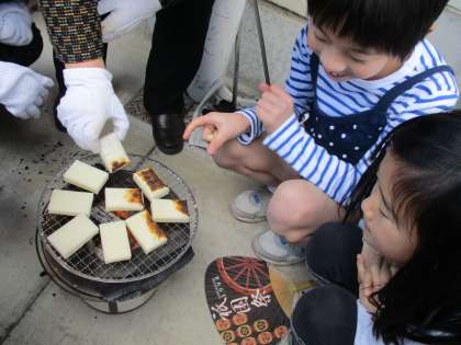 火おこしが終わると,いよいよ網にお餅をのせて焼いていきます。すると間もなく,辺りにお餅が焼ける香ばしいにおいがただよってきて…,子どもたちの顔にも自然と笑みがこぼれていました。