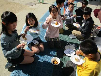 焼き立てのお餅を満面の笑みでほおばる子どもたちから,こんな声が聞こえてきました。美味しくお餅をいただいた後は,てきぱきと後片付けを頑張り,最後に行った終わりの会でも,「七輪を使うと,同じお餅を焼くのにも,たくさんの道具や時間が必要なのだと知りました」といった,昔の暮らしに思いをはせるような感想を聞くことができました。