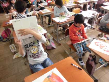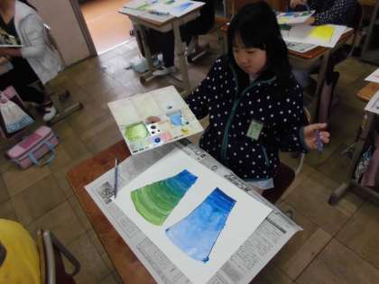 赤・青・黄の三原色を使って,自分の好きな色を作りました。新しい技法として「グラデーション」を練習しました。少しずつ色が変わっていく様を上手に表現することが出来ました。