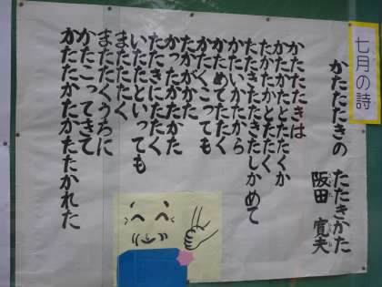 7月の詩は、阪田寛夫作「かたたたきの たたきかた」です。登校してくる子どもが少し足を止めて読んでいます。今日は、低学年の子どもが見守り活動をしてくださつている三上さんの肩をたたいていました。「かたたたき、じょうずやねえ。おうちでもしているの?」とたずねてもらっていました。