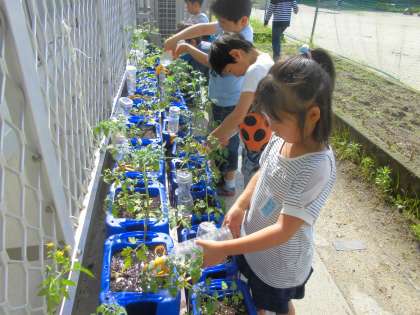昨晩から続いた強い雨が上がった今日の朝休み,運動場を見ると,昨日植えたばかりのプチトマトの苗に水やりをする子どもたちの姿がありました。「早く大きくなりますように」という心の声が聞こえてきそうな,朝の風景でした。