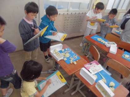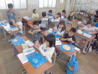 今日の図画工作科の授業は「にぎにぎねん土」ということで,にぎり方を工夫しながら,ねん土でいろいろな形を作りました。強くにぎったり,弱くにぎったり,指の跡をつけたり…。生き物や食べ物,身の回りにあるものなど,それぞれが想像をふくらませながら,楽しそうに作品づくりに励んでいました。また,その後の鑑賞会でも,友だちの作品のよいところをたくさん見つけることができました。