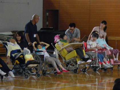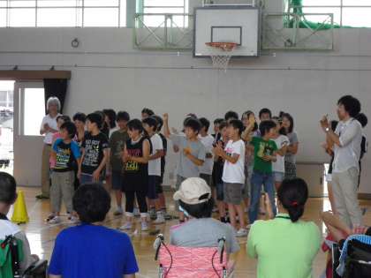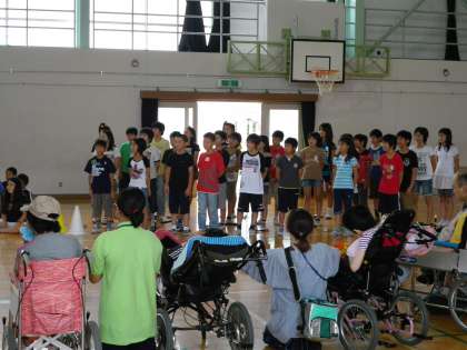 6年生は「総合的な学習の時間」を使って、重度障害者施設じゅらくさんと交流をしています。6月には、車椅子体験をしました。そして、今日は体育館で「七夕交流会」をしました。6年生が車椅子を押して、じゅらくの方たちの入場。まずクラス紹介をし、次にじゅらくの方たち一人ひとりの紹介がありました。