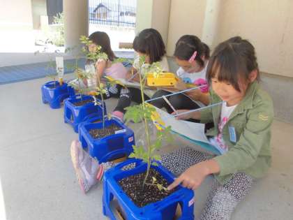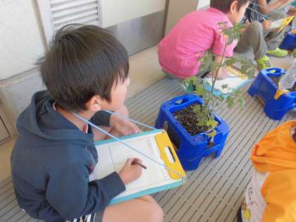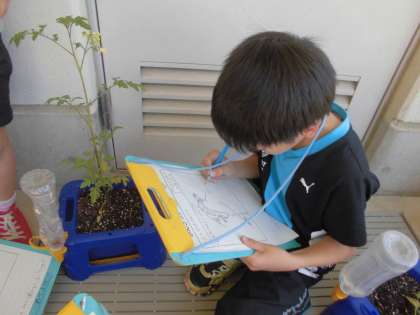 今日は,先日植えたミニトマトの観察をしました。「先生!もうトマトが大きくなってる!」「ちゃんと水をあげたからかなぁ」など,素直な思いを言葉にしつつ,色や形,大きさなど,子どもたちは気付いたことを一生懸命カードに書きとめていました。