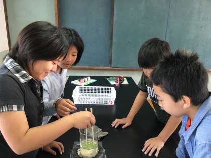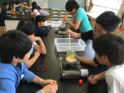 写真は,ジャガイモの葉を煮ているところです。この後,ヨウ素液に浸すと,なぜ植物が成長するのか,謎が解けますよ…。