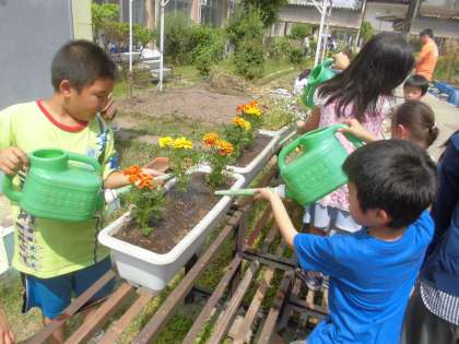 今日のそうじ時間に,お花の植え替えをしました。今回は,マリーゴールドを植えようということで,プランターに生えていた雑草を抜いたり,土を足したりして準備をした後,マリーゴールドの花を植えました。子どもたちのがんばりのおかげで,学校が花いっぱいの場所になっていっています。