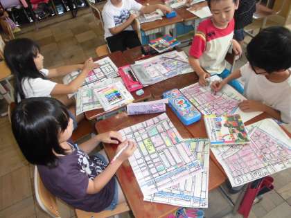 今日は、校区探検の4つのコースをつなげ合わせるための色付けをしました。分類ごとに色を分けながら、グループで協力して行うことができました。