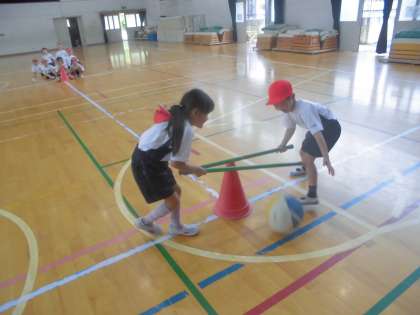 2・3組は運動場で「てつぼうあそび」,1組は体育館で「ようぐあそび」をしました。