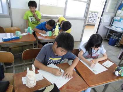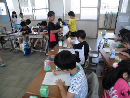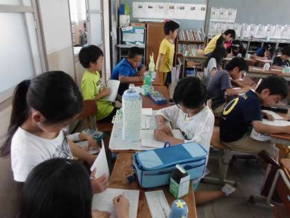 今日は図工で作った「夢色ランプ」の鑑賞をしました。まずは,周りが明るい状態で友だちの作品を鑑賞しました。角がついていたり,お菓子が乗っていたり,顔になっていたりと色々な工夫が凝らされている作品がありました。