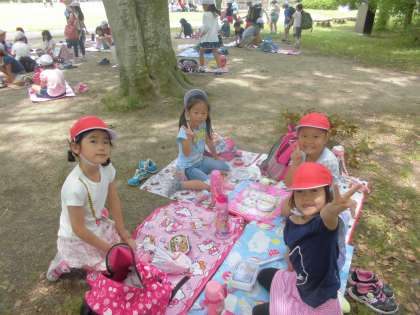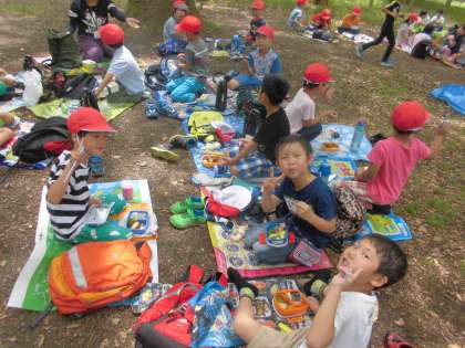 と,子どもたちは待ってました!とばかりにてきぱきとしきものを敷いて,グループで集まって,「いただきます」をして,お家の人が作ってくれたお弁当をパクパクと食べていました。