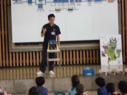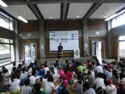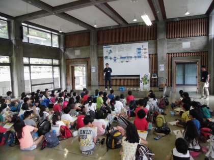 蹴上浄水場に着いて,まずは大きなホールで職員さんからのお話を聞きました。大きな図や模型を使って,これから見学する場所の特徴などを分かりやすく説明してもらいました。