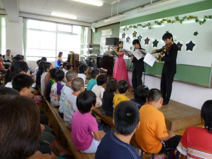 子どもたちは,お兄さんお姉さんの演奏にうっとりききほれていました。お姉さんのドレス姿とお兄さんのかっこよさにもみとれていました。突然のリクエストにも答えて,演奏してくださった時には,子どもたちは,感激していました。1時間30分があっという間に過ぎ,最初から最後までのりのりで楽しんでいました。
