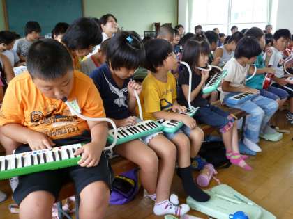 そして,鍵盤ハーモニカを吹いて,一緒に「かえるのがっしょう」「こいぬのマーチ」「かっこう」を演奏しました。