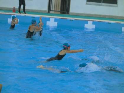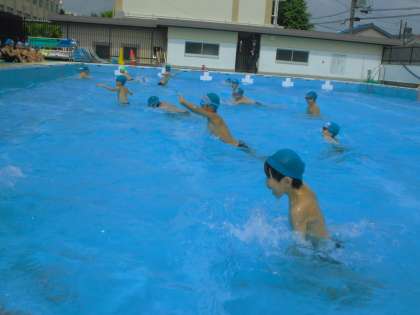 プールに入っても,「つめたーい!」という声がほとんど聞かれないほどの,暖かい(むしろ暑い)気候で,ロケットのまねやカエルのまねなど,楽しく水あそびに取り組むことができました。