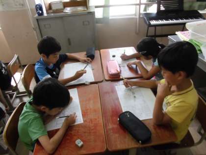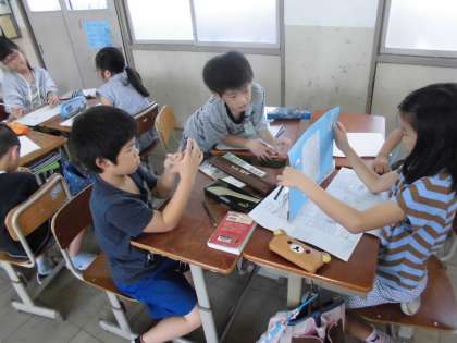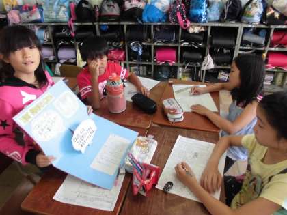 今日の国語は「一つの花」という物語を勉強しました。一つの花では「Showポップ」というものを作って交流をします。そのShowポップにはどんなことが書かれているのか,モデルを見ながら班で話し合いをしました。これから作るものに興味津々の子どもたちでした。