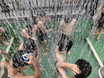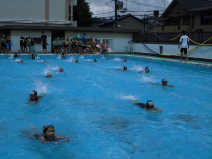 今日の水泳学習では,念願の「太陽」が顔を出してくれました。前回まではくもりだったり,小雨だったりしたので,「うわぁ,あったかい〜。」や「暑いし,もっと泳ぎたい。」という声も聞こえてきました。これからも晴れた時に配流れるといいですね。