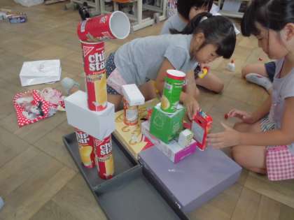 子どもたちは,ボンドやテープを使って,友だちと協力しながら,一生懸命に作品を作っていました。