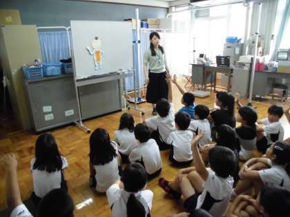 身体計測の前に養護の先生から,体の中の「水」についてのお話をしてもらいました。子どもたちは興味津々の様子で話を聞いていました。