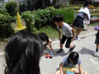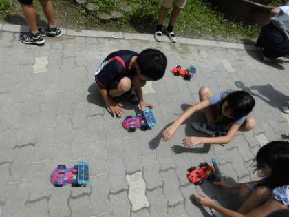 やっと,ソーラーカーを走らせられる日がやってきました。梅雨のせいか,太陽が雲に隠れている日が続きましたが,雲の隙間から顔を出した太陽の光をあびて,一斉にソーラーカーは走りだしました。車が走った時には「やったー。」や「いけー!」などの歓声が上がっていました。