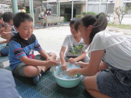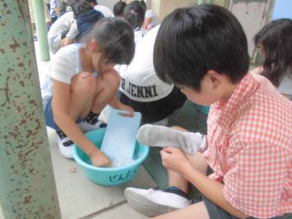 午後からは1組の洗濯です。みんなで一生懸命洗います。手洗いの方がきれいに洗えました。でも,少し生地がいたんでしまったかな?