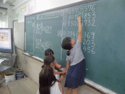 算数科で「1000までの数」を学習しています。今日は,“数の大小をしらべよう”ということで,数の大小を表す記号を新しく学習しました。初めは,矢印を勘違いする子どももいましたが,記号の意味を説明すると「なるほど!」と,練習問題にも意欲的に取り組んでいました。