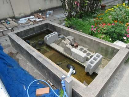 前から壊れていた亀の池の屋根を撤去し,新しいものに変えます。