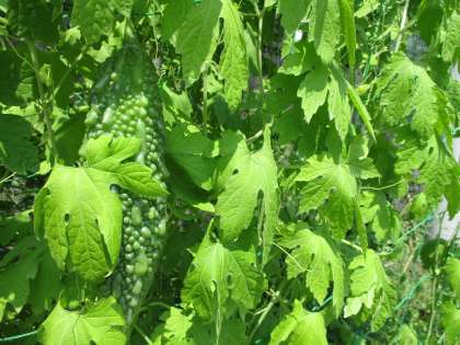 夏のギラつく太陽の下,ゴーヤもぐんぐん大きくなっています。