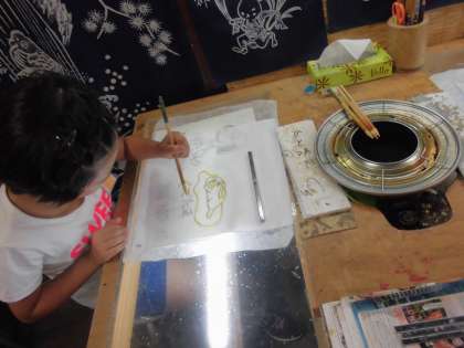 シーンと集中してロウで絵で描く姿は,まるで職人。