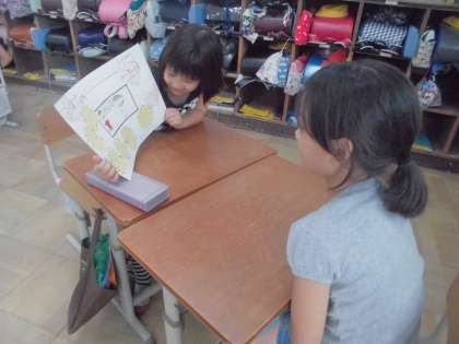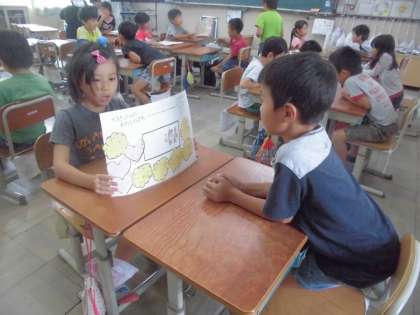 生活科「大すきいっぱい わたしのまち」の学習で,インタビューに訪れたお気に入りの場所について書きまとめたカードを,今日は学年で交流しました。クラスの枠をこえた交流に,子どもたちはとてもワクワクした様子で,葛野の町にはどんな素敵な場所があるのだろうと,一生懸命に友だちの発表を聞いていました。