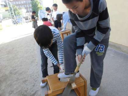今日は,のこぎりを使って木を切りました。のこぎりを初めて使う子が多く,「先生,全然切れへん〜。」と戸惑っていました。でも,しばらくすると「見て見て!切れたー!」と嬉しそうに戦利品の木片を高々と掲げて見せてくれる子がたくさんいました。「次は,くぎを打つよ。」と伝えると「え〜,まだのこぎりがいい〜。」と言っている子もいました。