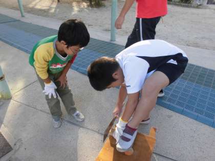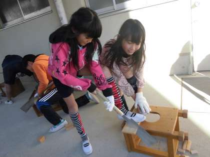 のこぎりは,引くと切れるというのは知っていても,実際にすると大変でした。クラスの3分の1の人が「のこぎりを使ったことがある」と答えてくれましたが,いざ切ってみると,みな大苦戦。木を押さえながら引いて切るというのが思っていたよりも難しかったようです。木が切れると「やった〜。切れた〜!」と達成感を味わっていました。次は,くぎ打ちもやっていきますよ。