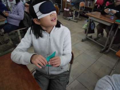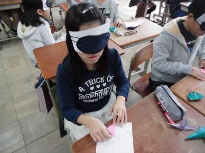 今日は総合的な学習の時間で,アイマスク体験 折り紙verをしました。まずは普段通りのままで,「鶴」を折ってもらいました。そこで,半数くらいの子が鶴を折れないという事実に驚きながらも,自分の折れるものを完成させました。次にアイマスクをしながら折ってみると,「全然わからん〜。」と困惑している子がいれば,数名ほどはスイスイと折ること子ができる子もいました。